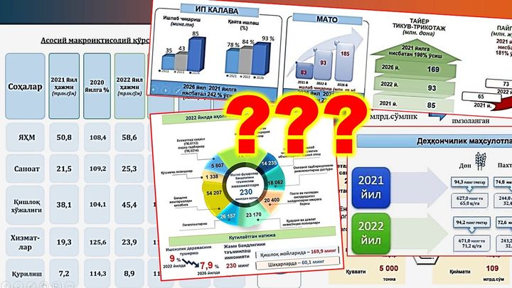 В первую очередь отмечу, что в сводной таблице допущены серьёзные арифметические ошибки. Например, при расчёте валового регионального продукта. Если сложить данные за 2021 год по промышленности, сельскому хозяйству, услугам и строительству, то получится 86,1 триллиона сумов. При этом в 2022 году этот показатель хотят довести до 59 триллионов сумов, хотя по той же таблице ВРП будет составлять 103,5 триллионов. Это невнимательность или расчет на невнимательность?
