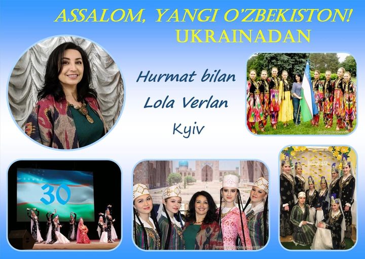 А вот из Киева (Украина) нам пишет сама Лола Верлан, хореограф, балетмейстер-постановщик, художественный руководитель Ансамбля танца «Росток», член Национального общества узбеков Украины: «Я родом из Ташкента, работала в Государственном заслуженном ансамбле танца УзССР «Бахор». Я живу и работаю в Киеве. Больше 20 лет занимаюсь популяризацией узбекской культуры. Мы изучаем историю, культуру, разучиваем узбекские танцы и выступаем на международных фестивалях и концертах… Поздравляем вас с 30-летием независимости Республики Узбекистан! За 30 лет узбекистанцам удалось построить стабильное, успешное, экономически развитое общество. В эту юбилейную дату сердечно поздравляем всех узбекистанцев! Желаю вам и вашим семьям мира, согласия, крепкого здоровья, исполнения всех надежд, успехов и благополучия! Пусть процветает наша Родина - независимая Республика Узбекистан!».
