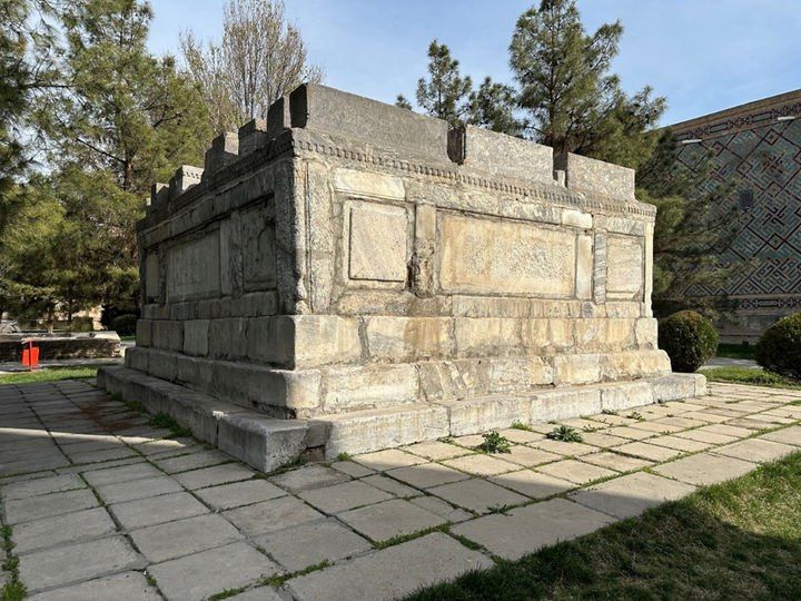 В Самарканде, на территории комплекса Регистан, находится большая мраморная платформа – склеп. Многие туристы интересуются тем, кто похоронен там. Тем более, что на склепе установлено несколько надгробных камней.