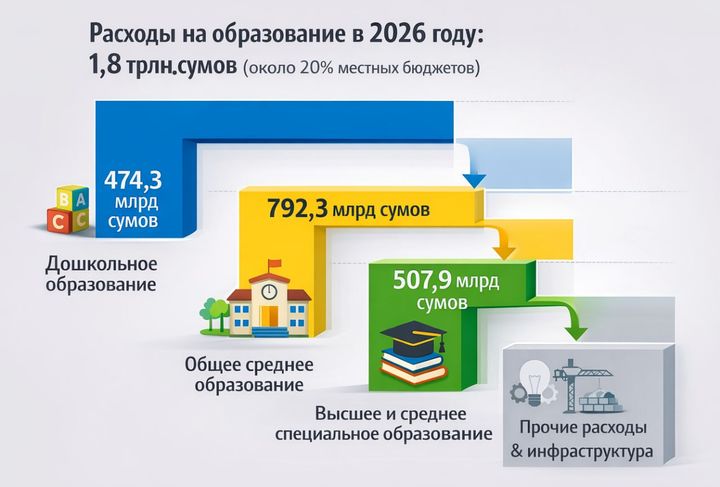 Исходя из приоритетных задач, обозначенных Президентом в сфере развития дошкольного и школьного образования, внедрения современных образовательных программ и повышения качества обучения, на образование будет направлено 1,8 трлн. сумов, что составляет около 20% всех расходов местных бюджетов. В частности, на дошкольное образование предусмотрено 474,3 млрд. сумов, что на 137,2 млрд. больше по сравнению с утвержденным планом прошлого года. Расходы на питание детей в государственных дошкольных учреждениях составят 349,7 млрд. сумов, что на 67% больше, чем годом ранее.