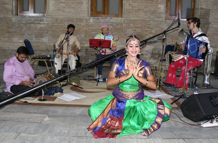 Но, помимо указанных музыкантов, в группе играют Винод Шьям Анур (мриданг, табла, шейкер, коннакол) и Джо Веспел, он же Битденкер (гитара, эффекты), а создает неповторимую атмосферу индуистского храма Ниведита Шарма - танцовщица из Карнатика – края, где тысячелетиями сохраняются классические каноны музыки и танца. И эти каноны были представлены самаркандцам.