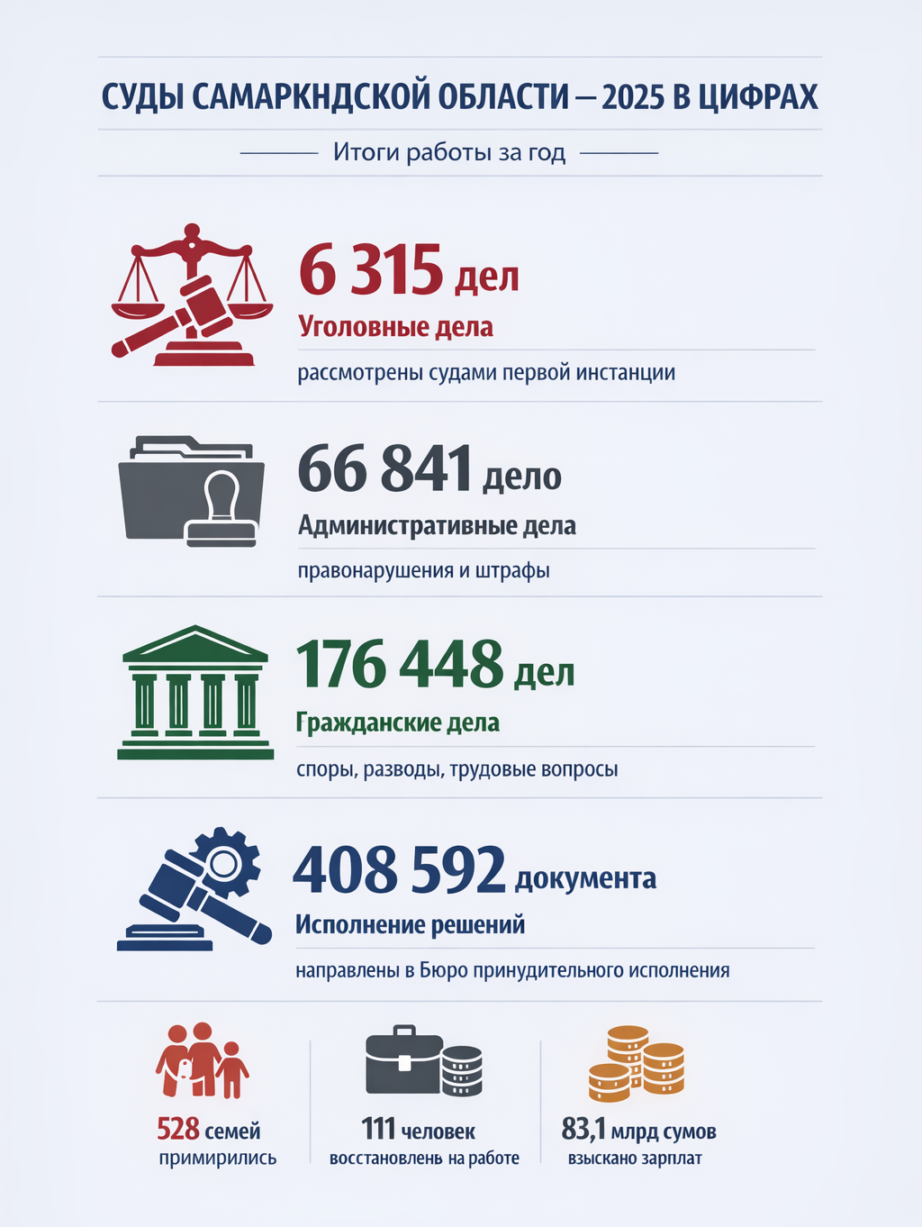 На брифинге, состоявшемся в Самарканде, представители областного суда представили подробные итоги работы судебной системы за 2025 год. Здесь озвучено много ключевых показателей: от числа рассмотренных уголовных дел и решений апелляционных инстанций до динамики гражданских споров, результатов примирения семей и исполнения решений через Бюро принудительного исполнения.