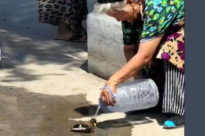 Жительница Андижана напоила водой изможденную от жары птицу