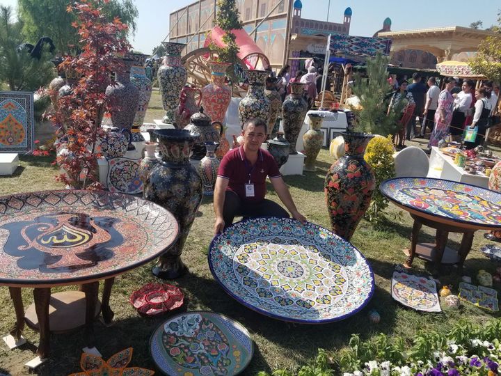 На площади Урда я встретил сотни ремесленников, приехавших, как и я, для того, чтобы представить изделия, изготовленные методом и по рецепту наших предков. Среди гостей было немало деятелей культуры, знатоков древней чеканки, керамики, вышивки золотыми нитями и мастериц сюзане, а также ценителей восточной миниатюры. Мое внимание привлекло изделие риштанского гончара Равшана Точиддинова. Его лаган диаметром более метра и салатница в виде цветка с семью лепестками, в каждый из которых можно положить приличную порцию закуски или сладостей, притягивали к себе гончаров, прибывших из различных стран мира. Я тут же, отталкиваясь от этого произведения декоративно-прикладного искусства, набросал в свой блокнот несколько идей, которые собираюсь воплотить в жизнь.