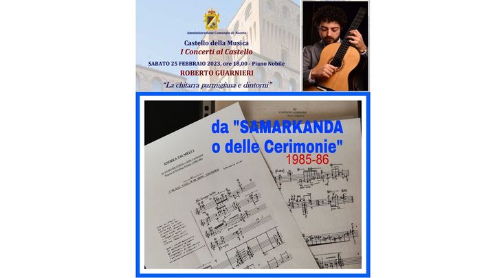 Ведущим исполнителем программы стал талантливый итальянский классический гитарист Роберто Гуарньери. На вечере в Замке музыки гитарист исполнил музыкальные произведения итальянского композитора Андреа Тальмелли, написанные на стихи поэтессы Эвелины Шац, вошедшие в ее книгу «Самарканд или книга церемоний» (Samarcanda o delle cerimonie, 1985-1986), изданную в Италии.