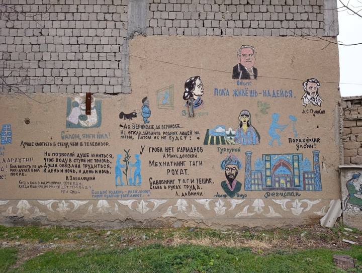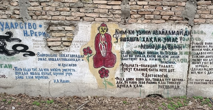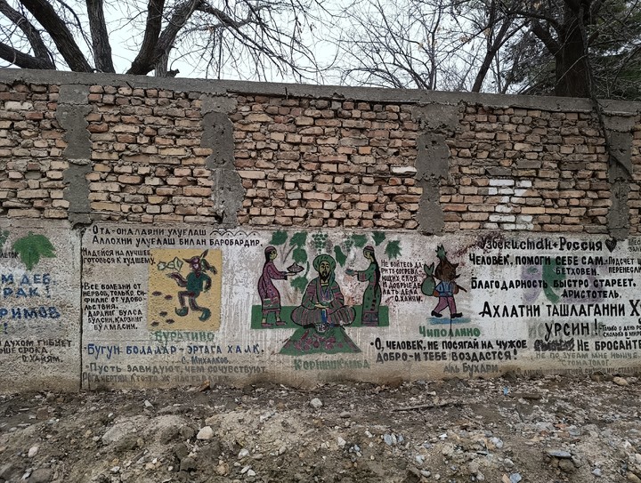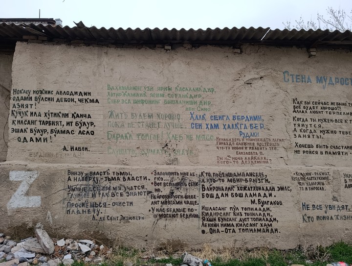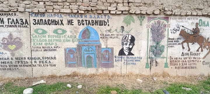 Есть на одной из улочек в Самарканде стена, которая не похожа на другие. Она молча разговаривает с прохожими. Кирпичи с грубой штукатуркой, а на ней – рисунки, портреты классиков и десятки надписей. Здесь соседствуют Навои и Булгаков, народные пословицы и житейские мудрости, наставления и юмор. Все это - мир Рафаэля Султановича Хуснутдинова, человека, решившего общаться с городом, его жителями и многочисленными гостями через своеобразные граффити.