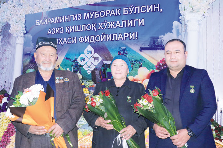 За многолетний самоотверженный труд в сельском хозяйстве, богатый урожай, повышение благосостояния наших людей, экспортного потенциала, обеспечение продовольственной безопасности, успешное осуществление реформ в сельскохозяйственном секторе и реализации государственных программ, выдающийся вклад в совершенствование и внедрение передовых сельскохозяйственных технологий группа работников сельского хозяйства была удостоена нагрудных знаков «Узбекистон Республикаси сув хужалиги аълочиси», «Илғор фермер», «Узбекистон Республикаси кишлок хужалиги фидойиси» и почетными дипломами хокимията области.
