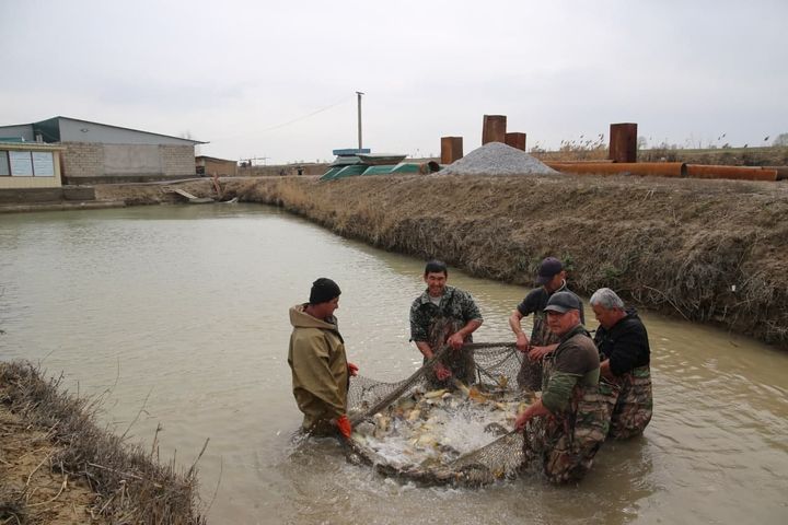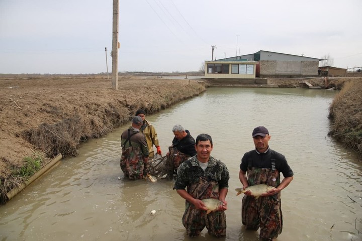 Хороших показателей достигло и фермерское хозяйство «Ахмаджон Орзу куллари». Площадь акватории составляет 60 гектаров. Только в 2021 году хозяйством было выращено 200 тонн доступной рыбной продукции.