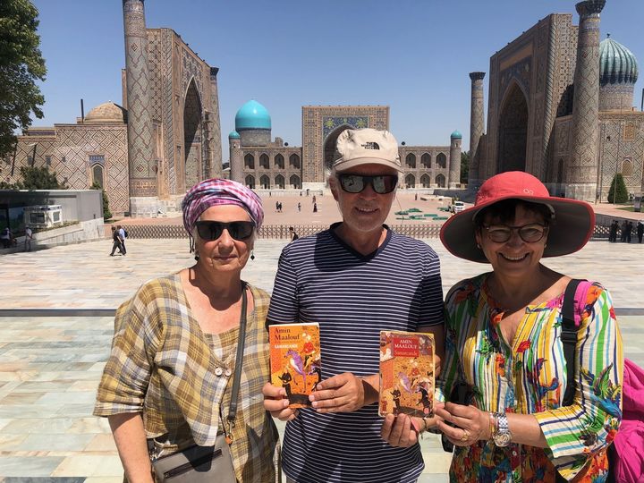 Фотосессия: площадь Регистан, Кристиана, Лорелла и Роже держат в руках роман «Самарканд» Амина Маалуфа
