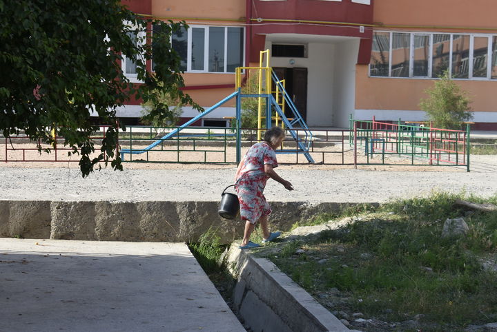 70-летняя Мадина Дагалакова проживает в новом многоэтажном доме № 2, расположенном на территории махаллинского схода граждан «Ташкент» Джамбайского района. Из-за отсутствия питьевой воды и лифта, она ежедневно вынуждена таскать воду ведрами со двора соседнего дома, поднимаясь на 5-й этаж.