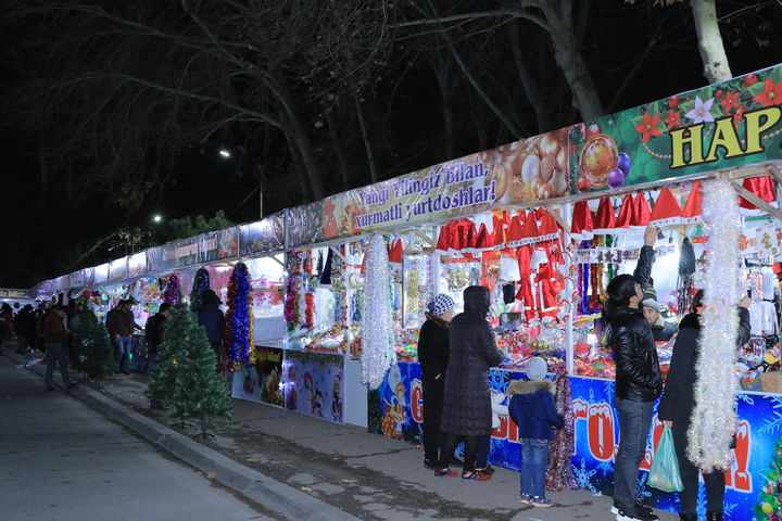 В Самарканде идёт подготовка к новогодним празднествам. Атмосферу сказки придают красивые иллюминации и установленные елки по городу и конечно же, традиционная новогодняя ярмарка, которая расположилась у областного театра музыки и драмы.