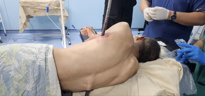 При обследовании выяснилось, что металлический стержень вошёл в левую часть грудной клетки и вышел с правой стороны в области 10–11 грудных позвонков.
