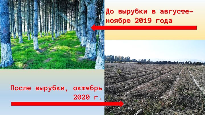 Прибыв на место бывшего соснового бора, экологи убедились в том, что здесь теперь фермерские грядки огурцов и капусты, а по арыкам всё еще валяются сосновые шишки и корневища. Туда же из районного отделения экологии и хокимията привезли документы, на основании которых и был вырублен сосновый бор.