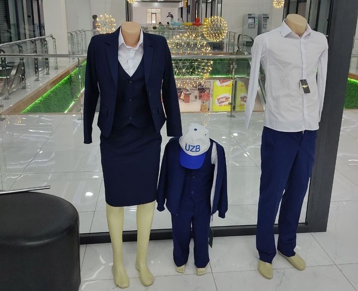 На вешалках в пластиковых футлярах «Turkey style» и «Fiffa» размещена форма для учеников с 1 по 6 и с 7 по 11 классы. В комплекте три вещи вместо четырех – синие курточка на молнии, жилетка, брюки или юбка без подкладки. Рубашка в набор почему-то не вошла. Стоимость одного комплекта для младших классов 210 тысяч, для старших – 350 тысяч сумов. Рубашки и блузки стоят от 50 тысяч сумов, причем самые дешевые, естественно, из стопроцентной вредной синтетики, которая вызывает переохлаждение, дерматиты и другие заболевания.