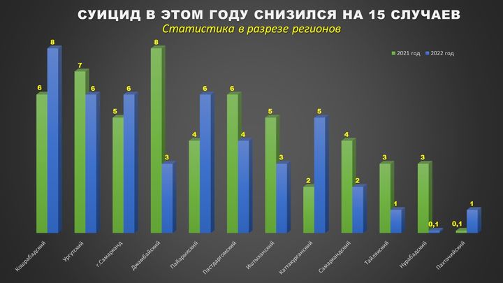 Согласно данным, полученным от областного управления по делам семьи и женщин, рост суицида среди женщин наблюдается в Кошрабадском и Ургутском районах. Тройку лидеров замыкает г. Самарканд. Наименьшее количество самоубийств зафиксировано в Нурабадском и Пахтачийском районах.