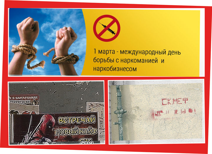 Вот уже больше месяца в жилых массивах г. Самарканда, на торцах домов и дверях подъездов можно увидеть рекламу сайта, через который осуществляется продажа синтетических наркотических веществ СК и мефа. Красные граффити и яркие наклейки с надписью «Встречай новый кайф» размещены практически через дом, а в одной из махаллей прямо напротив здания МСГ.